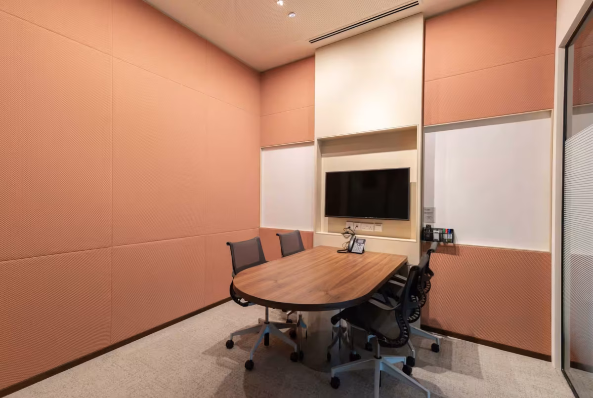 Equipped with a 43″ TV with HDMI connectivity, a whiteboard, and video conferencing tools, the room is primed for seamless communication and collaboration. Natural light filters through its sleek glass walls, enhancing productivity and focus, while the minimalist interior ensures a distraction-free environment. Accessibility is thoughtfully considered with elevator access and a wheelchair-friendly layout, catering to diverse guest needs.